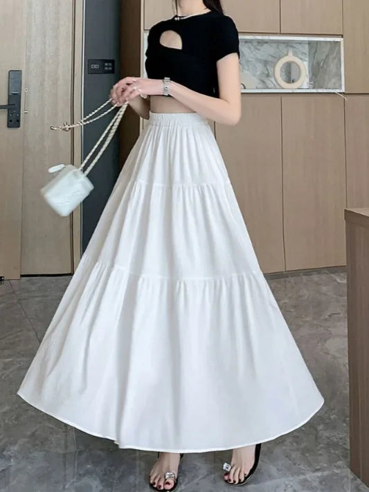 1pcs Women Skirts Girls High Waist Chic Long Cake A-line Skirt Female White Black Vintage Fashion With Lining Long Dress