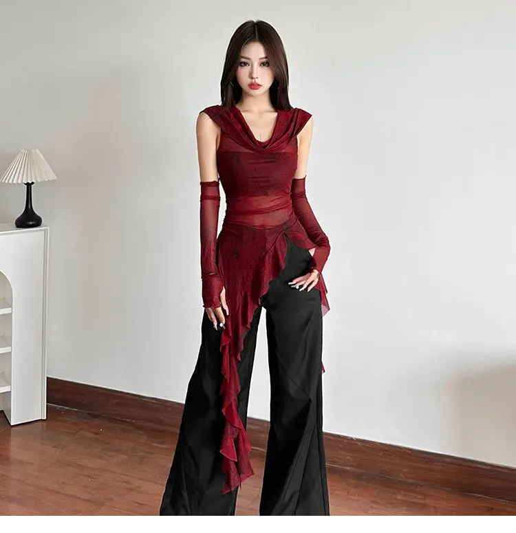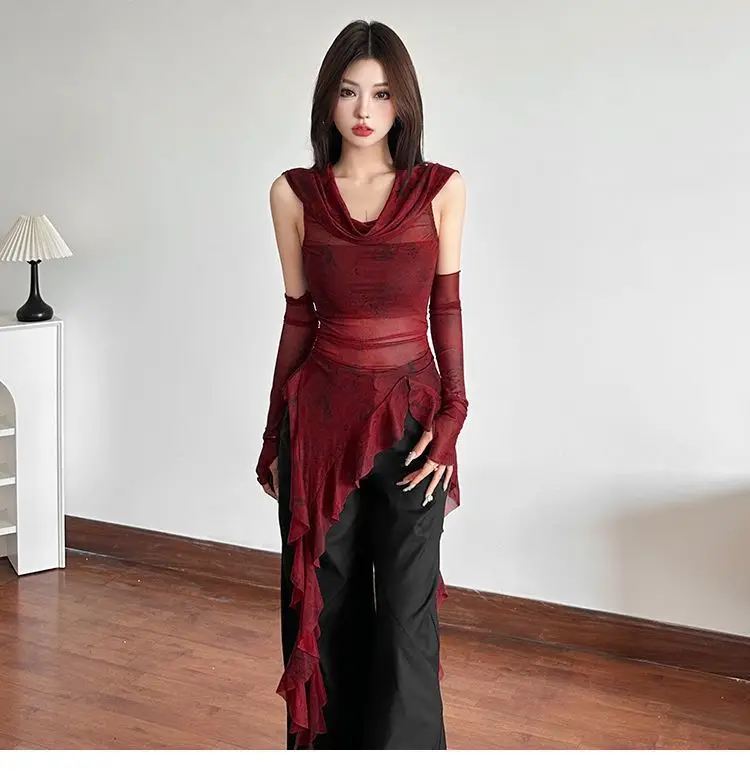 Ruffle Long Sleeve Sexy T-Shirts Fashion Women Y2K Irregular Asymmetrical Korean Crop Tops Casual Sheer Mesh Autumn Chic Tees